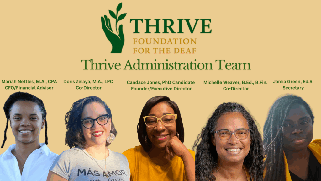 Thrive Foundation for the Deaf was born from a grassroots vision to create affirming, language-rich environments for Black and Brown Deaf children and families facing systemic barriers. What started as a community-driven initiative has evolved into a national nonprofit organization focused on equity-driven education, Deaf-led advocacy, and culturally sustaining resources.